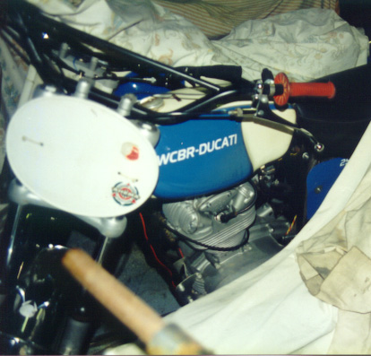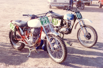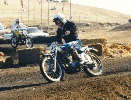 We obtained this Ducati Scrambler in 1985, it was in pretty good condition at the time. The picture at left is from 1991 and taken at Fernley, NV. Eric Tucker (#22) would ride it on this occasion. Below is Mike Green at the Cow Palace 1987 for the vintage indoor TT (MG finised 2nd). |