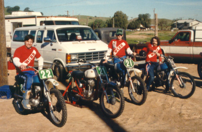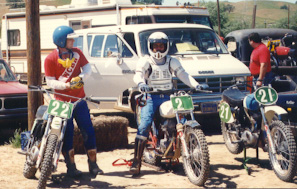 Above: Mike Green on his B50 practices in the lot behind his Dublin shop 1986. Right: Eric Tucker on the C15 BSA playing in the mud behind WCBR 1986. Below-Right: Another long time Dublin Honda rider from the early 1970's is Steve Woolverton, shown here on the WCBR prepared '74 Husky WR400 at DeAnza 87. Bottom: 1988 - #21 Mike Green's C15 BSA, #22 Eric Tucker's C15 BSA & Ducati 250 Scrambler. |
