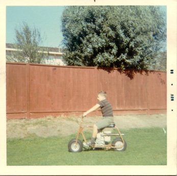 Right: Here's Rob riding his mini-bike in his Dublin yard in 1968.... Below: Rob hard at work leading the Sportman 125 class at Sandhill National 1990. |