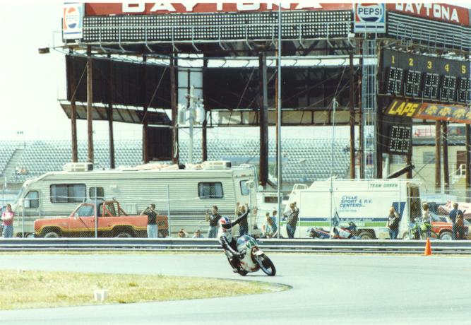Above: Daytona 1988; Mike Green wins the 250GP for the third straight year. |