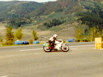 Left: Steamboat Springs, CO. 350GP Race: Mike Green is on 21, the third bike in line, he started on row-3. Bret Morshead leads with the 350, Scott Borem is second... Green was in this event as a blocker, thus allowing Bret to gain maximum points. Borem won however. |