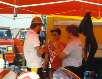 Below: L-R; Bret Morshead, Mike Green and Craig McLean discuss post race BS at Daytona '89. |