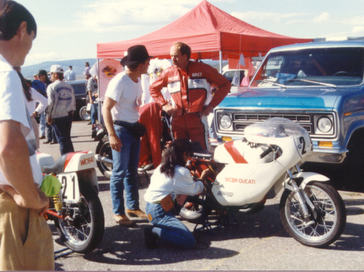 Below: Steamboat Springs 1991; Bret Morshead (in red leathers) chats it up, while wife Barbara attends to the 350. Bret finished 3rd in the 500 Premier race in the rain & hail! |